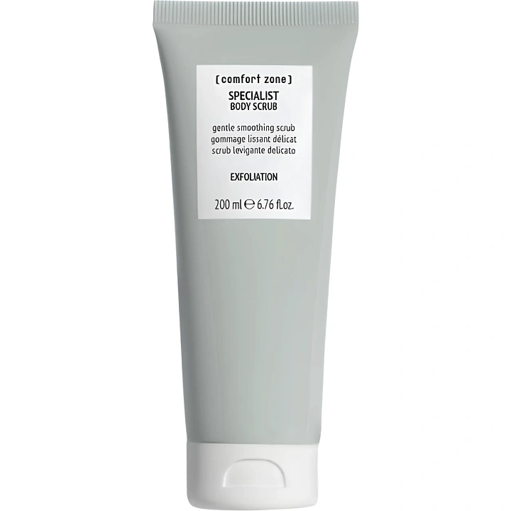 Деликатный роскошный скраб для тела Comfort Zone Specialist Body Scrub с частичками абрикосовых косточек, обеспечивает равномерное отшелушивание, стимулирует обновление кожи, тонизирует и делает кожу исключительно мягкой. Подготавливает кожу к эпиляции предотвращает врастание волосков после эпиляции.