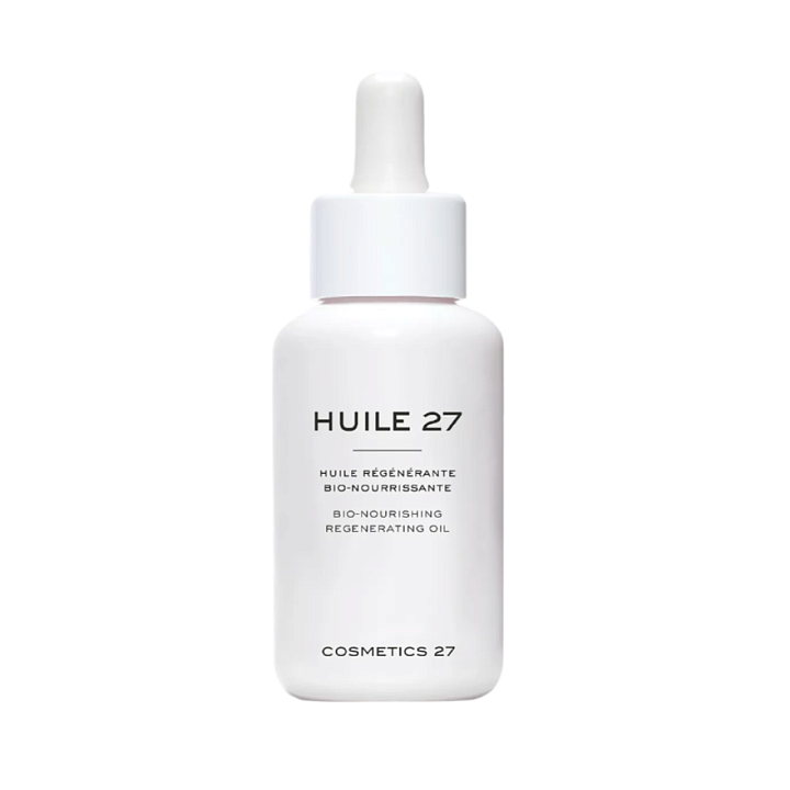 Cosmetics 27 Huile 27 – высококонцентрированное масло-эликсир для интенсивного омоложения кожи.Защищает от негативных факторов окружающей среды. Комбинация 7 растительных масел (включая такие редкие как гибискус и тигровый орех), обогащенных Омега 3 и 6 кислотами, усилена мощными активами с клинически доказанным регенерирующим, защитным и антивозрастным действием. Эликсир усиливает синтез коллагена, выравнивает тон кожи и обладает антиоксидантным действием. Идеальное средство для создания эффекта глянцевого сияния кожи Glow Skin. Применяется как самостоятельное средство или в комбинации с кремом Baume 27 для усиления эффекта и обогащения его текстуры.