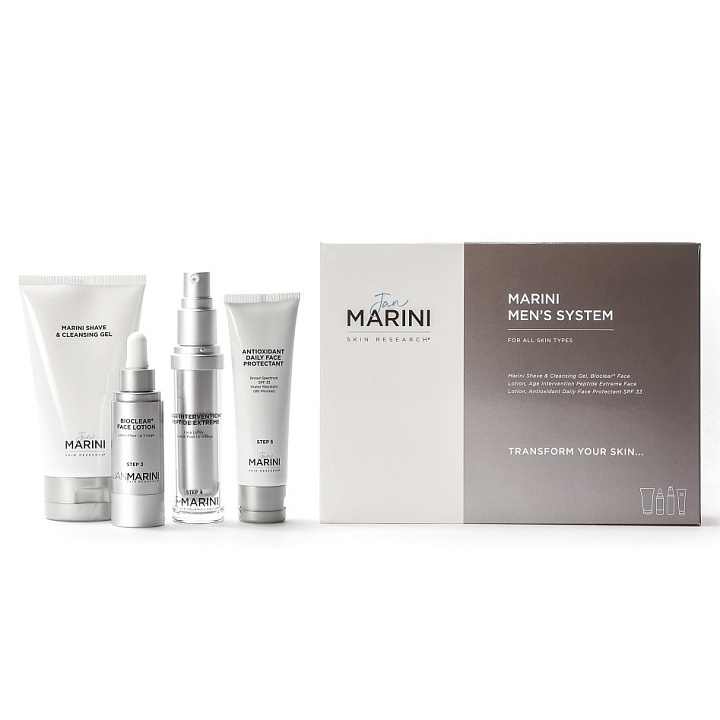 Комплексная система по уходу за кожей Jan Marini Men's System, разработанная специально для мужчин. Продукты в этой системе помогают бороться с признаками старения, увлажняют кожу, улучшают текстуру и тон, а также защищают от внешних агрессивных факторов, таких как загрязнение и ультрафиолетовые лучи. Система также включает средства для очищения кожи и борьбы с раздражением после бритья. Каждый продукт в наборе содержит активные ингредиенты, направленные на решение различных проблем, характерных для мужской кожи, включая жирность, грубую текстуру и склонность к воспалениям.