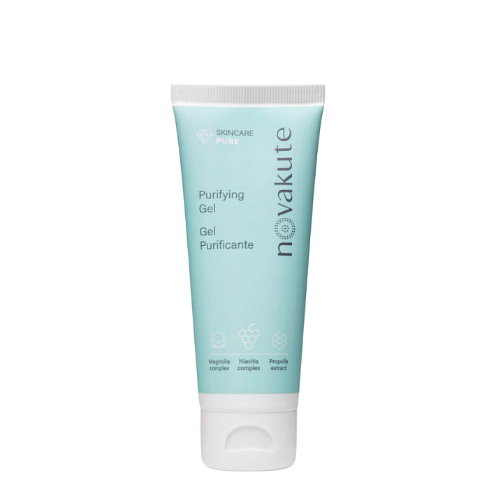 Очищающий гель Novakute Purifying Gel. Деликатно очищает кожу и регулирует выработку кожного сала. Он дарит коже жизненную силу и сияние, сохраняя её увлажнённой. Ключевой компонент геля – запатентованный комплекс NIAVITIS®. Это инновационная синергетическая комбинация полифенолов, извлеченных из косточек белого винограда, и ниацинамида. Он помогает предотвратить образование свободных радикалов и замедляет старение кожи. Содержание экстрактов прополиса и магнолии придают гелю антимикробные свойства. Цинк, азелоилглицинат и ниацинамид регулируют нормальную выработку кожного сала и мягко очищают кожу. Благодаря действию активных ингредиентов кожа защищена от внешних воздействий, а лицо становится более свежим и здоровым. Гель помогает уменьшить видимость пигментных пятен, избавиться от излишней жирности и тусклости кожи, а также минимизировать размер пор.