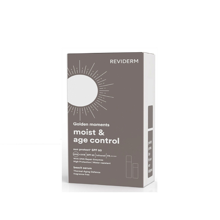 Антивозрастной набор для защиты от солнца Reviderm Golden Moments moist & age control. Мультифункциональный солнцезащитный крем SPF 50 с ферментами, которые входят в комплекс защиты ДНК и помогают бороться с вредным ультрафиолетовым воздействием. Инновационная формула защиты от солнца предотвращает преждевременное старение кожи и появление пигментных пятен, обеспечивает сияющий цвет лица. Увлажняющая сыворотка с гиалуроновой кислотой и природными увлажняющими факторами (NMF) защищает кожу от обезвоживания во время пребывания на солнце и после загара.