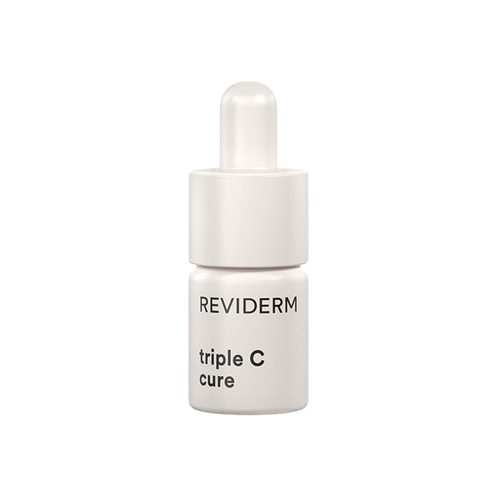 Сыворотка с витамином С с лифтинг-эффектом Reviderm Triple C cure. Средство обладает уникальной 2-фазной системой, которая сохраняет чистый витамин С в виде пудры до соединения с сывороткой, что гарантирует его высокую эффективность. Продукт идеально подходит для области вокруг глаз. Высокая концентрация витамина С способствует синтезу коллагена, укрепляет и подтягивает контур лица, осветляет пигментные пятна. Через три недели состояние дермы улучшается, контур лица подтягивается, кожа разглаживается.